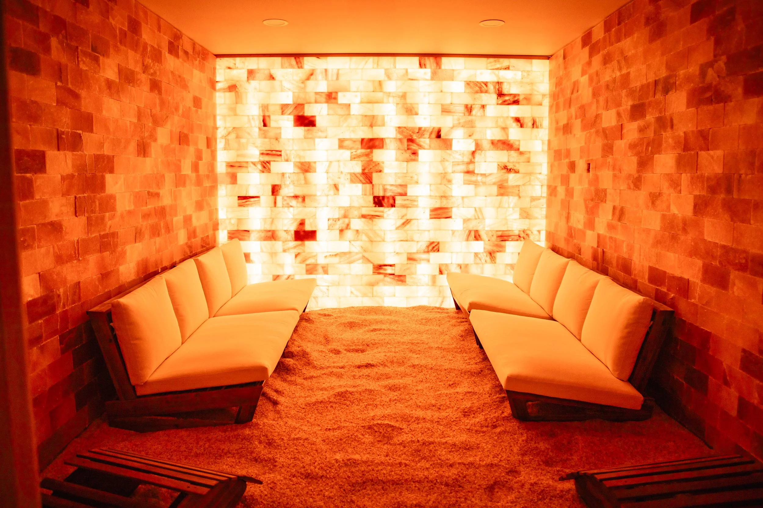 The most unique addition to PURE’s new space is its wellness lounge, featuring a breathtaking Himalayan Salt Room, also known as the “Himalayan Salt Vault.” This room is lined with hand-carved pink salt blocks, and the floors are enveloped with loose pink salt to enhance the overall benefits of this halotherapy. The experience is renowned for its detoxification and stress-reducing benefits.